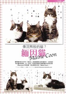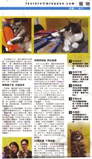 Since we established our Maine Coon cattery, we have received quite a lot of attention from different media in the press, namely, feature articles as well as interview articles in pet magazines (Cat’s Life, My Pet, Pets Magazine), lifestyle magazine (U-Magazine) and newspaper (Ming Pao Daily). Below are the more unforgettable ones.很慶幸, 我們的緬因貓得到過不少出版物的報導, 包括寵物雜誌, 如貓之生活, 寵物閑情及貓犬通訊. 另外, 亦接受過生活雜誌(U-雜誌)及報章(明報)的訪問. 以下是其中一些的分享. |