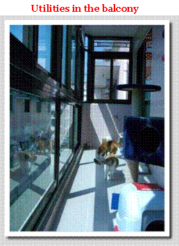 The long balcony (about 80 square feet) of our home is our general feline members’ favourite spot. This balcony is fenced with glass windows. They can always safely look outside to watch birds and butterflies flying across the sky. Their utilities, including their litter pans, food bowls, water dispenser as well as the cat tower, are all located here. An interesting point with the design is that there are two glass doors connected to this balcony, one leading to the sitting room and the other one leading to our spacious bedroom. When both doors are opened, they will play hide-and-seek. It’s really great fun watching them roam about the places excitedly!