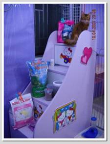 The Show Cats’ Room is mainly for our show cats. Here, the air-conditioner is turned on almost round-the-clock to ensure that our show cats’ coat can be kept in premium condition. There are funny stuffs in this room, namely, a colorful sofa bought from Sea Horse, a tailor-made ‘Fun Fun Staircase’ for them to climb up and down and also for storage of cat items in the drawers, a toy wooden bed bought from Ikea, and of course, wooden layers for them to jump up and down as well. So, this room is both functional and inspirational.
