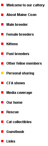 Special thanks must be given to Manyee Cattery and Foxhouse Cattery. Both Mr. Raymond Ng and Mr. Joseph Wong have given us invaluable advice and practical assistance in many ways in various stages of the setting up of our cattery. The former is also my grooming mentor while the latter entrusted his show Somali, Foxhouse Leonardo, to me. It was through showing my Somali that I developed deeper and deeper interest in cat shows. Raymond has always been a strict but kind mentor. He tells us right away whether our grooming is up to standard or not. He has also given us vision into cat shows and breeding. Without his enlightenment, we would have been contented with fair standards, given that my husband and I are both born to be pretty laid-back type person! |