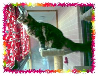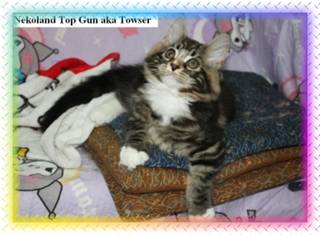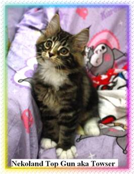Top Gun是一只很愛親近人的貓咪. 在第二窩小貓當中, 他是最重和最大的. 在他5.5月大接受絕育手術時, 他已經9磅了, 體重是一般其他品種的成貓的重量呢! 現在, Towser與他的新主人及一頭歐洲短毛貓住在2000呎的大宅內. 看到他被寵愛著, 我們十分欣慰.