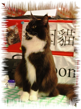 Zorro is our very first homebred Grand Premier. He was a 2-show grand and achieved his Grand title in the 2009-2010 show season. He is now living a happy life with his new papa Mr Kwok. Thanks Mr Kwok for keeping him in such good condition and taking him to shows! We are looking forward to some more achievements from this boy, who is praised by judges for his nearly perfect ear set, a nice muzzle, a long body and his shiny tuxedo coat. 黑俠梭羅 (又名“可樂仔”)是我們貓舍的第一頭自家繁殖的超級冠軍(絕育貓組), 他只比賽二場便由冠軍貓晉升為超冠, 令我們及他的新主人郭先生開心不已. 梭羅仔擁有高高直直的双耳, 方形的口套, 典型的長身軀及閃亮的禮服毛色. |